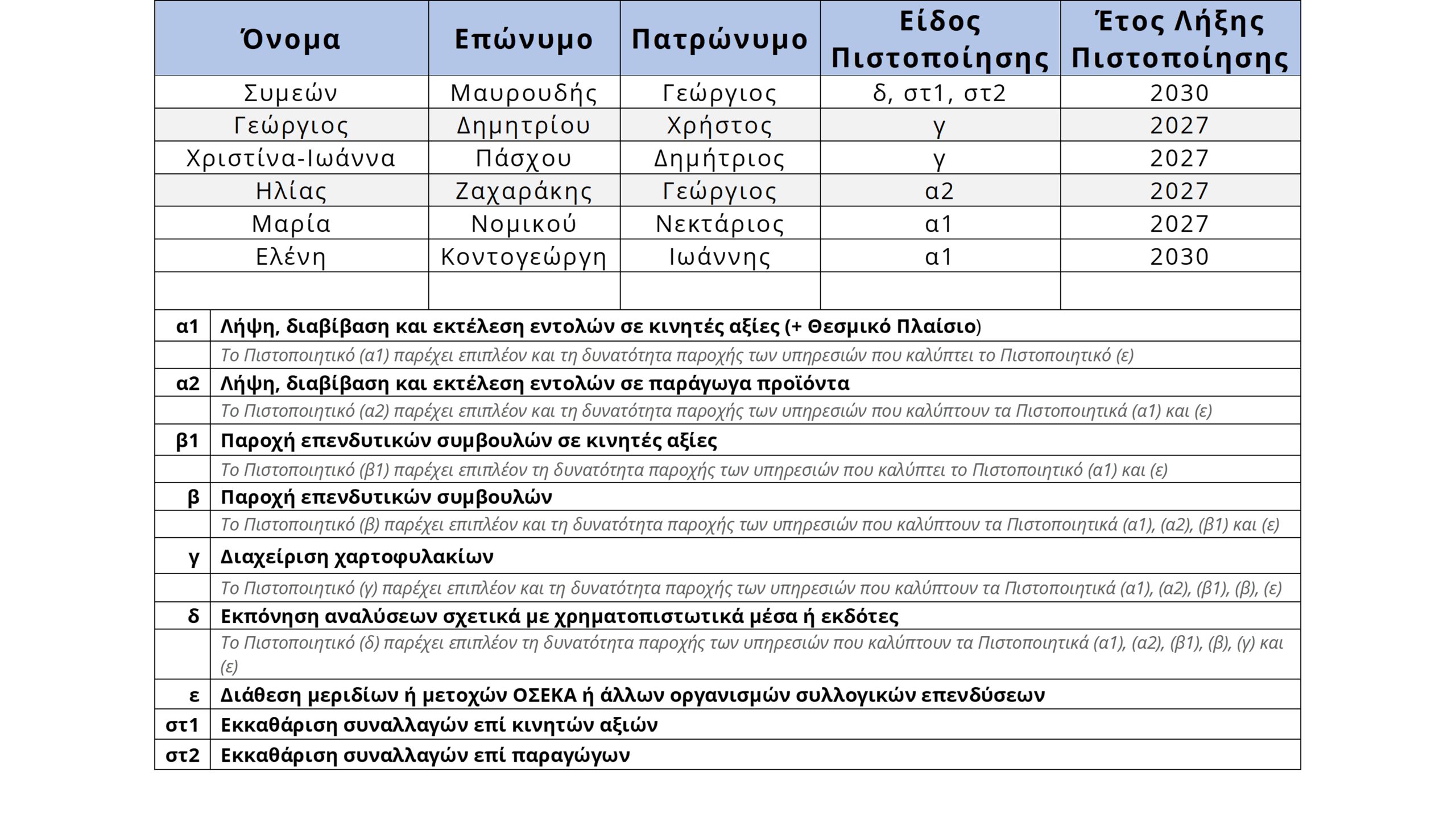 βρείτε τον συνολικό κατάλογο πιστοποιημένων στελεχών της Επιτροπής Κεφαλαιαγοράς εδώ
